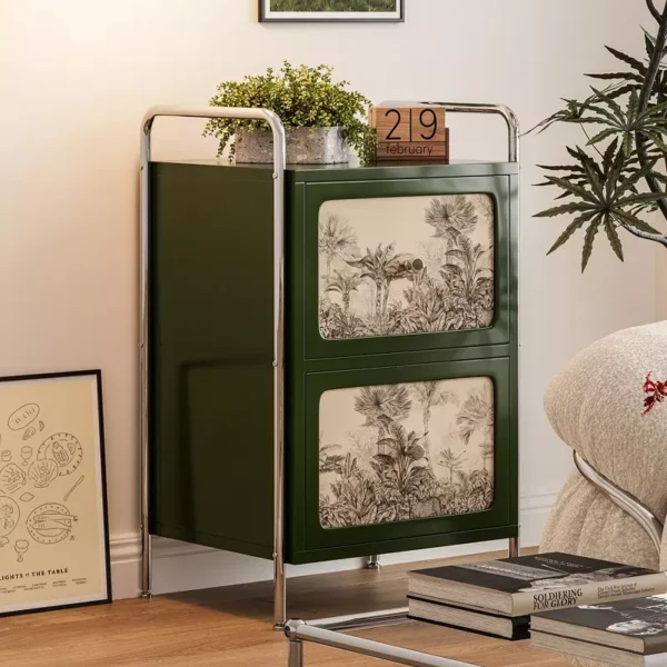A sturdy, modern serving table adds a practical and elegant touch to your living room. Made of high-quality engineered wood and beech wood with a sturdy metal base, it's available in attractive colors including black, light green, and green with a leaf pattern. Ideal for serving drinks or arranging décor, it features practical dimensions and is easy to maintain. It comes with a two-year warranty against manufacturing defects for the Gulf countries.