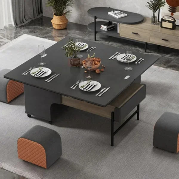 طاولة قهوة متعددة المزايا مع 4 كراسي . تُعد طاولة القهوة قطعة أثاث أساسية في أي منزل، حيث تُستخدم لتناول المشروبات، وتناول الوجبات الخفيفة، واستقبال الضيوف، والعمل على الكمبيوتر المحمول، أو حتى لعب الألعاب. تتميز طاولة القهوة المتعددة المزايا بتصميمها العصري وألوانها الجذابة، مما يجعلها إضافة مثالية لأي ديكور داخلي.
