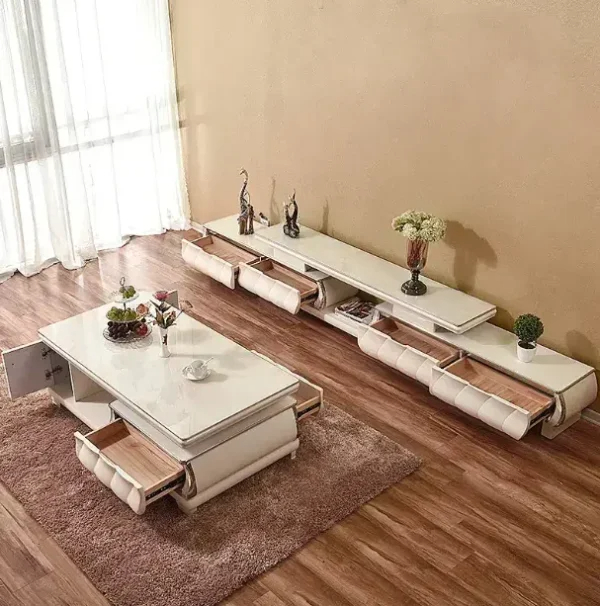 لا غنى عن اقتناء هذا الطقم العصري إلى أثاثات منزلكِ. يتكون من طاولة قهوة وطاولة تلفزيون، مصمّم بطابع فاخر ونمط فريد، إضافة إلى تفاصيل راقية تبرز جمال اختياراتكِ، كما أنه مصنوع من خشب هندسي وخشب زان روماني عالي الجودة تضمن لكِ الاستدامة.
