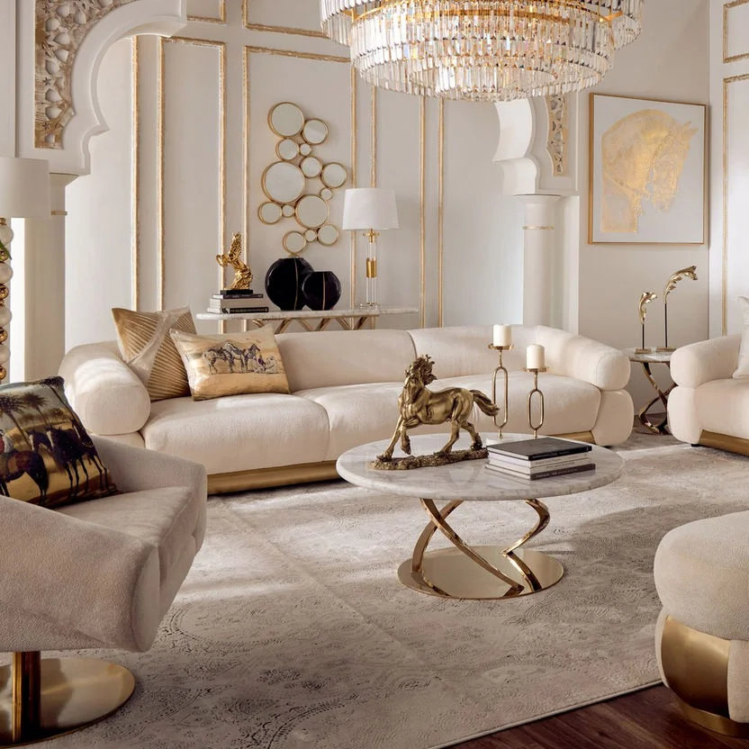 تأتي هذه الطاولة بلون أبيض مع تفاصيل ذهبية، مما يمنحها مظهرًا أنيقًا وفاخرًا يتناسب مع أي ديكور داخلي.