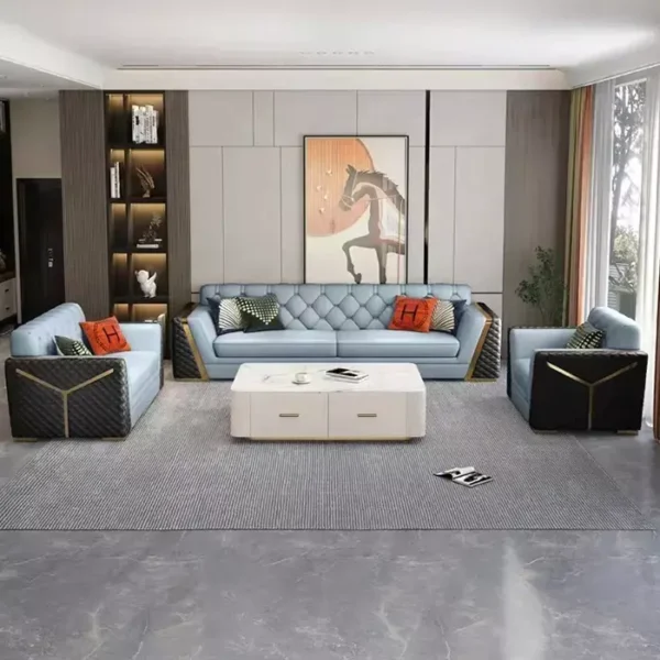 This sofa set adds an elegant and modern touch to your living room. Designed with high-quality Italian leather and a durable wood frame, it offers both comfort and elegance. It comes in a variety of colors and comes with a two-year warranty.