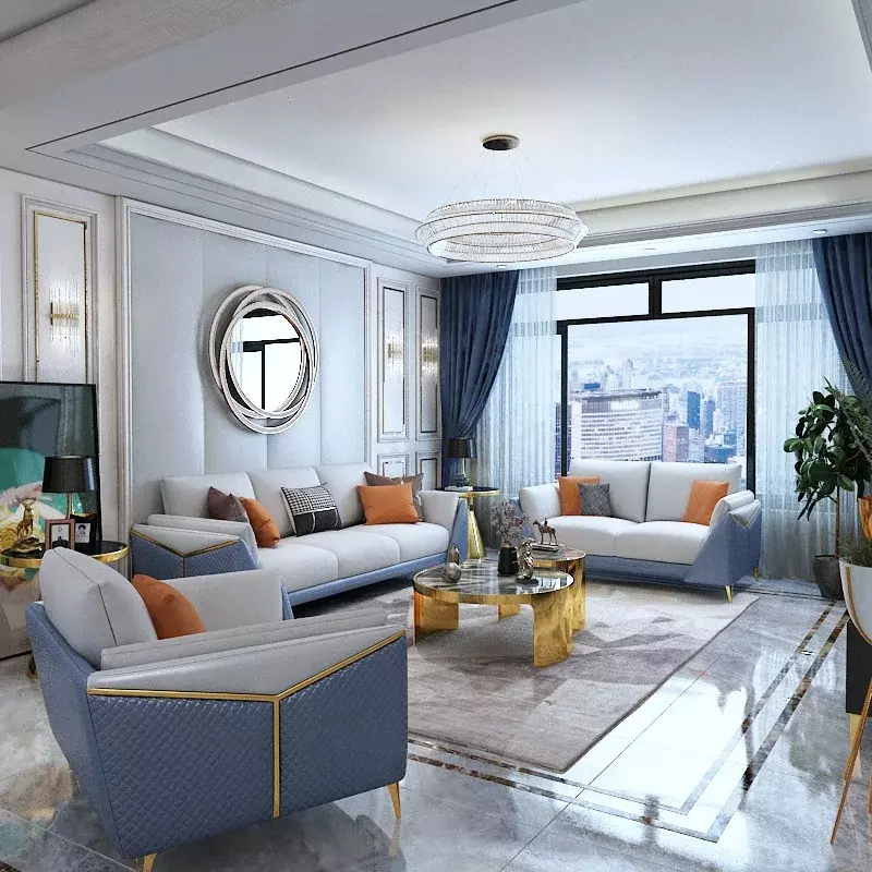 طقم كنب مودرن لتجهيز غرفة معيشة كاملة لا ينقصها شيء، مجلس ازرق فاتح مكون من كنبة ثنائية وكنبة ثلاثية وكرسي مفرد بالإضافة إلى 2 طاولة جانبية وطاولة قهوة مكونة من طاولة صغيرة وكبيرة متداخلتين، مصنوع من أجود الخامات ليمنحك الراحة التي تستحقها مع مزيج من الفخامة والدفء في المكان الان في Saudi Arabia.