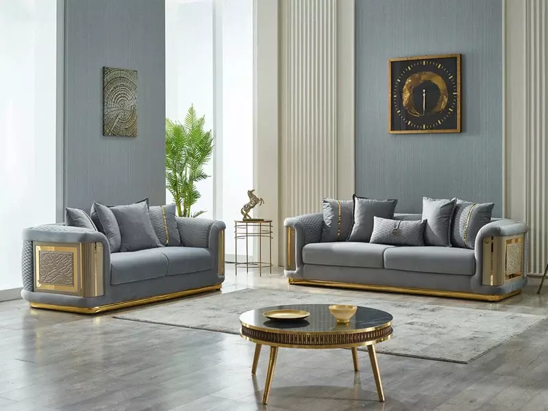 A complete sofa set consisting of (2 single chairs + 1 double sofa + 1 triple sofa) featuring luxurious materials made of a durable Romanian beech wood frame, a gilded steel frame, and luxurious fabric lined with high-density foam for unparalleled comfort. With an extended warranty for ultimate confidence.