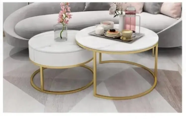 - الطقم مزود بطاولتين بتصميم راقٍ وسطح رخام فاخر مع أرجل معدنية.