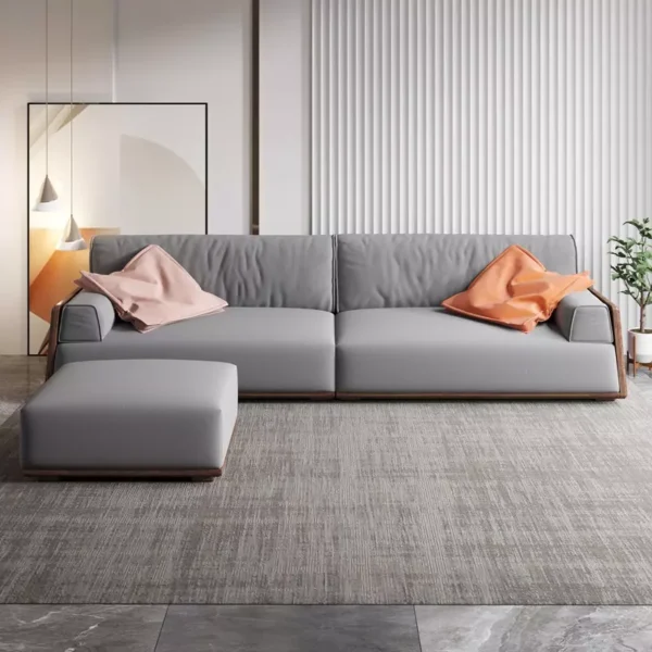 A modern sofa with a contemporary and comfortable design, combining elegance and practicality. Made of high-quality engineered wood and Romanian beech wood, it is filled with high-density foam for comfort. It is upholstered in luxurious leather, making it easy to clean with a light touch. It comes with a distinctively designed footrest. Available in multiple colors, it suits any decor. A two-year warranty against manufacturing defects.