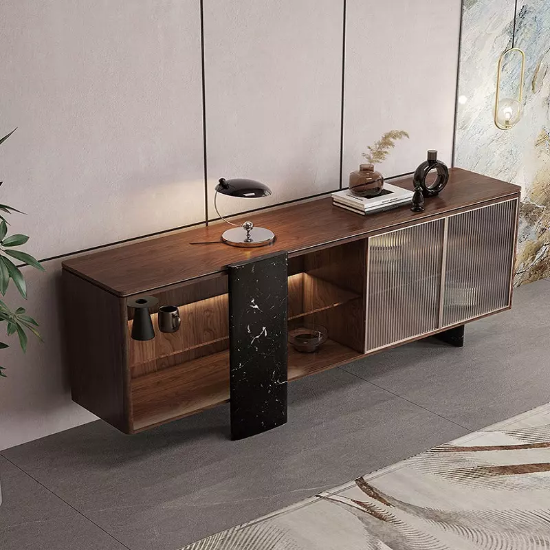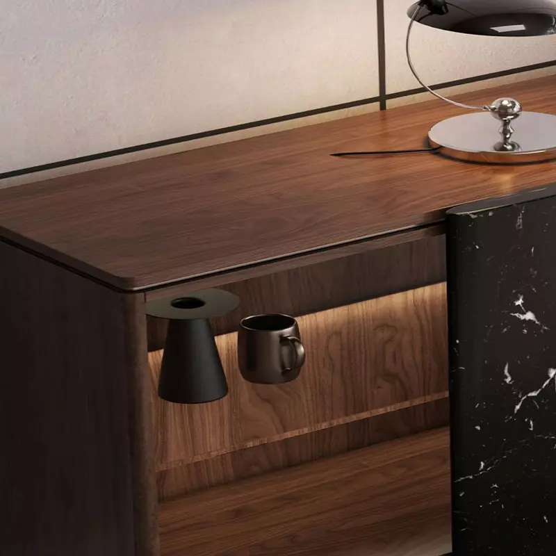 يتميز بوفيه هذا بهيكل متين مصنوع من خشب هندسي وخشب زان روماني عالي الجودة، مع قواعد رخامية تضفي قوة واستقرارًا. كما تم إضافة لمسة راقية من الزجاج المموه المقوى المقاوم للكسر.