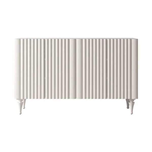 بوفيه جانبي عملي وأنيق بواجهة منقوشة وأبواب متعددة تخفي مساحات تنظيم مرتبة. مناسب للسفرة أو الصالة مع رفوف قابلة للتعديل وسطح علوي لعرض ديكوراتك.