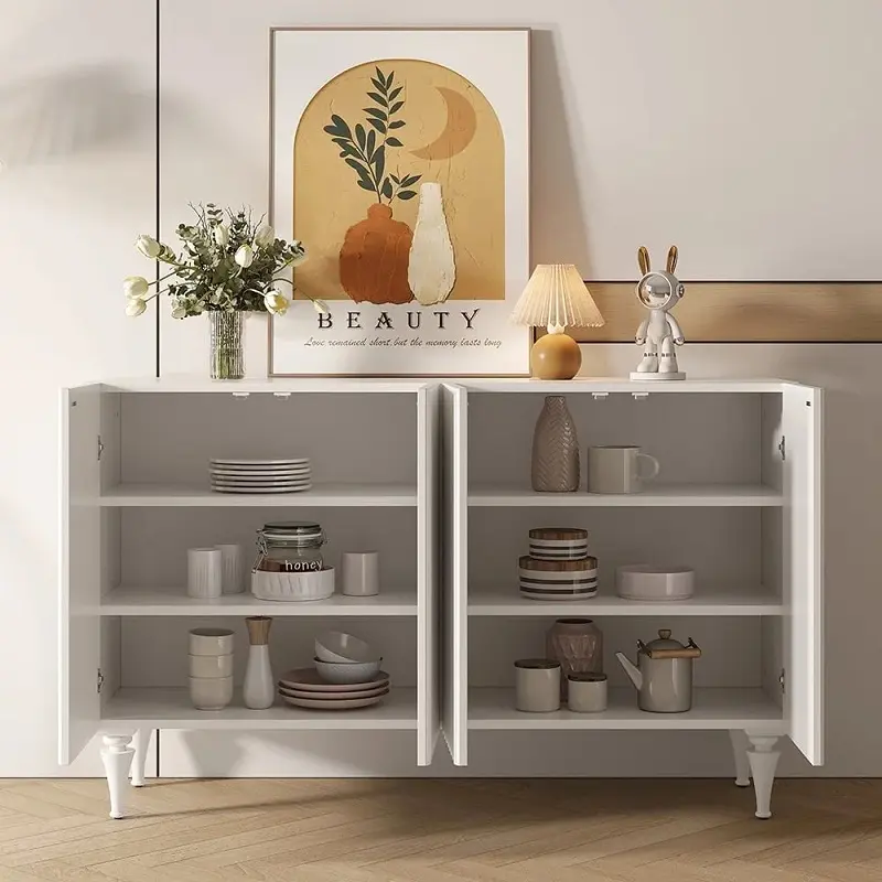 يضم البوفيه أربع أبواب تفتح على ستة مساحات تخزينية مناسبة لتنسيق أدوات المائدة، المناديل، الفوط، أو مستلزمات التقديم. هذا يخفف ازدحام الطاولات والخزائن ويجعل الوصول للأغراض أسرع في المناسبات والاستخدام اليومي.