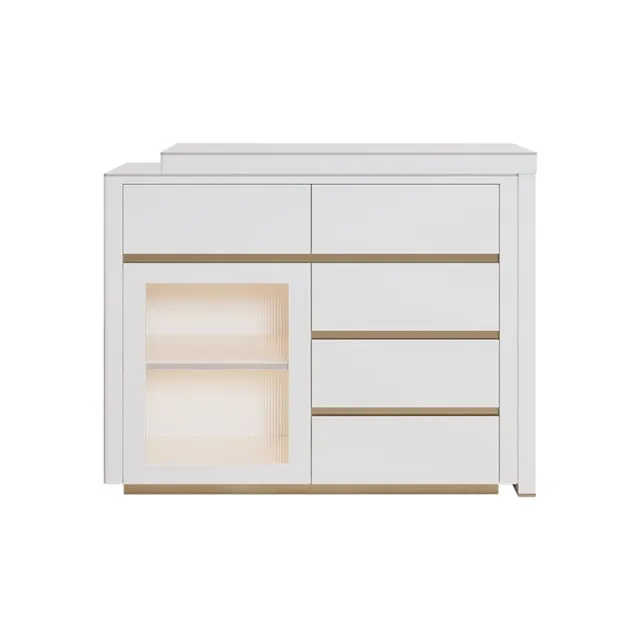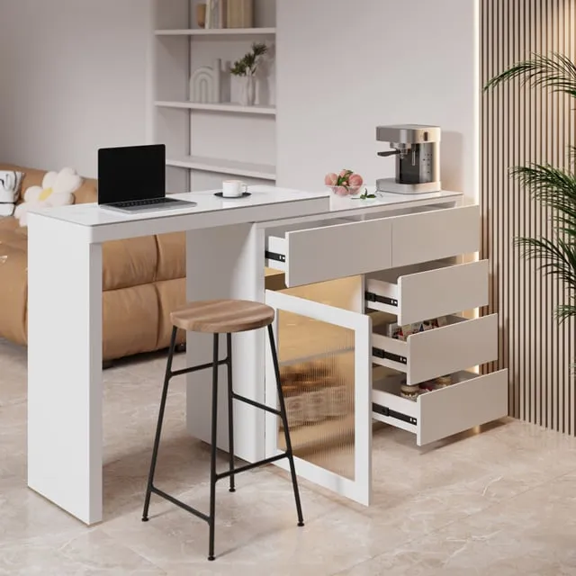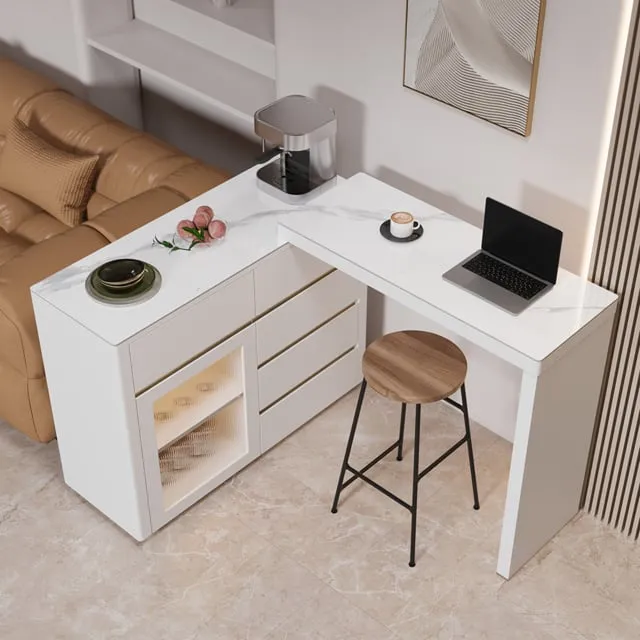 طاولة بار مميزة تأتي بتصميم قابل للتمديد يلائم الاستخدام اليومي والمناسبات. و سطح رخامي بملمس فني يعزز الفخامة. و خمس أدراج عملية لتنظيم التخزين. مع رف سفلي مفتوح يزيد من الاستخدام العملي للمساحة. مناسبة لوضعها خلف الأريكة أو في الزوايا كمحطة بار منزلية. سهلة التنظيف: فقط امسحها بلطف للحفاظ على مظهرها اللامع.