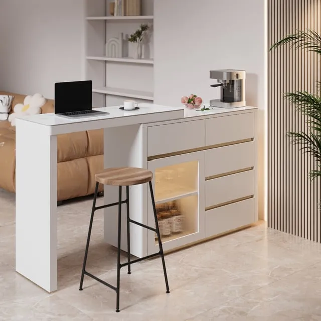 طاولة بار متعددة الاستخدامات بتصميم عصري، قابلة للتمديد، مصنوعة من خشب زان متين عالي الجودة، مع سطح رخامي فاخر وخزانة تخزين مدمجة.
