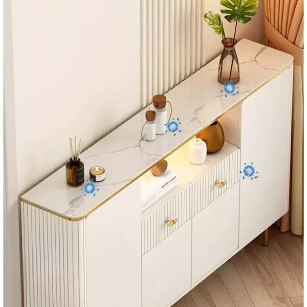 The buffet table is an essential piece for any kitchen or dining room, combining elegance with practicality. It's crafted from high-quality engineered wood and Roman beech wood, with a high-quality marble top for a touch of luxury. It features sturdy metal legs for stability and durability. Available in multiple sizes and a white finish, it comes with a two-year warranty against manufacturing defects in the GCC.