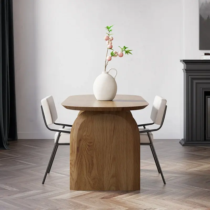 الطاولة تعتمد أسلوبًا هادئًا في التفاصيل مع خطوط ناعمة تجمع إحساس الدائرة والمستطيل في قطعة واحدة. هذا يرفع من قيمة المكان بصريًا ويجعلها مناسبة للديكورات الحديثة وكذلك المساحات التي تميل للطابع الكلاسيكي الخفيف. اللون الطبيعي للخشب يعطي إحساسًا دافئًا ويظهر جمال العروق بشكل لطيف داخل غرفة الطعام.
