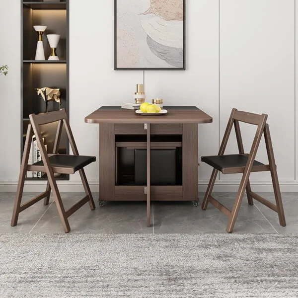 طقم عملي وأنيق لغرفة الطعام: طاولة مستطيلة قابلة للطي لتوفير المساحة، مع كراسٍ مريحة بتنجيد جلد سهل التنظيف وحشوة إسفنج لجلوس يومي مريح.