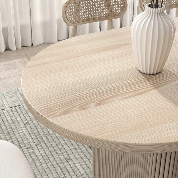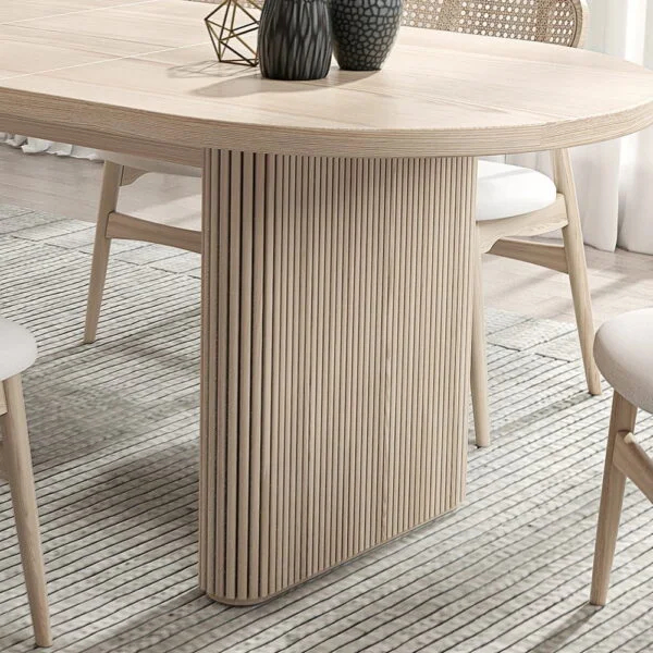 طاولة عملية بتصميم بيضاوي آمن وزوايا ناعمة، تتكيف مع ضيافتك بسهولة وتمنح غرفة الطعام شكلًا مرتبًا ومريحًا للاستخدام اليومي.