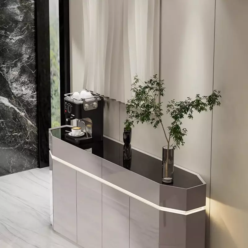 تأتي طاولة البوفيه هذه بمزيج رائع من التصاميم المبتكرة والخامات عالية الجودة، مما يجعلها إضافة مثالية لأي منزل. تتميز بهيكل قوي مصنوع من خشب زان متين وهندسي، مما يضمن الثبات والمتانة لسنوات طويلة. سطح الطاولة مصنوع من رخام لامع ومتين، مما يضيف لمسة من الفخامة والرفاهية. كما تم تزويدها بإضاءة متوسطة لإضفاء لمسة فنية رائعة، مما يجعلها قطعة مثالية للمجالس والمناسبات.