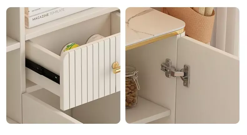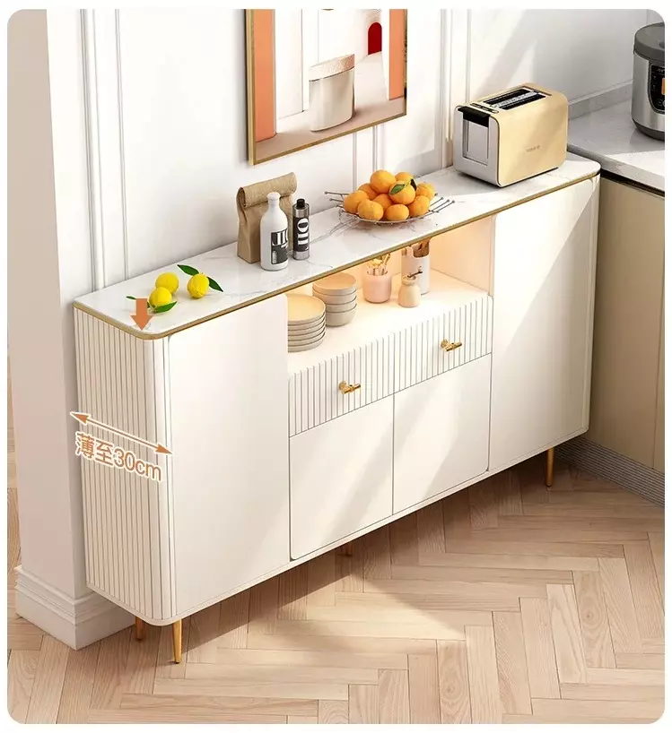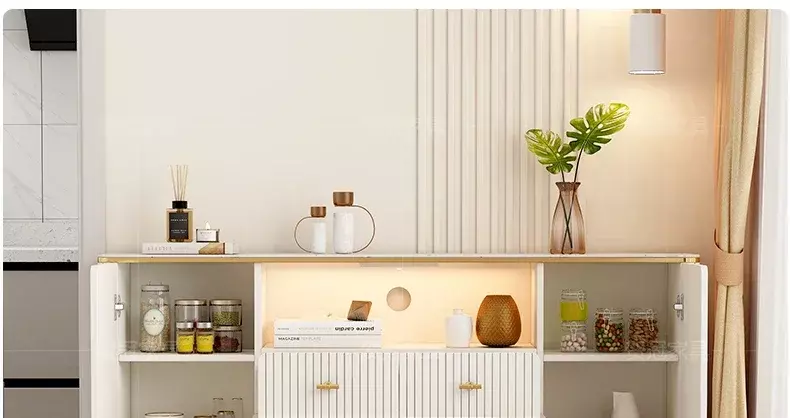 This Scandinavian-designed buffet table combines elegance and practicality. It's crafted from high-quality engineered wood and Roman beech, with sturdy gold-plated metal legs. Available in four different sizes, it's ideal for your space. Its white finish gives it a clean look, making it suitable for most interiors. It comes with a two-year warranty against manufacturing defects, making it an ideal choice for enhancing your dining room's appearance in a modern and functional way.