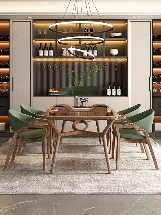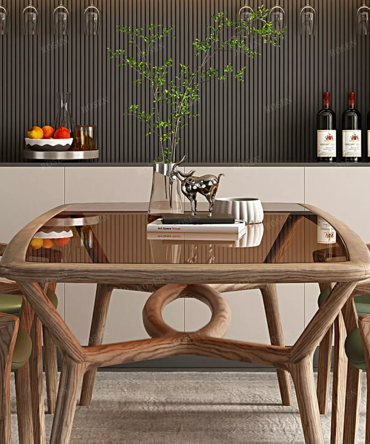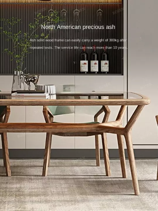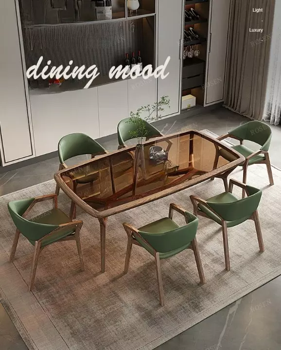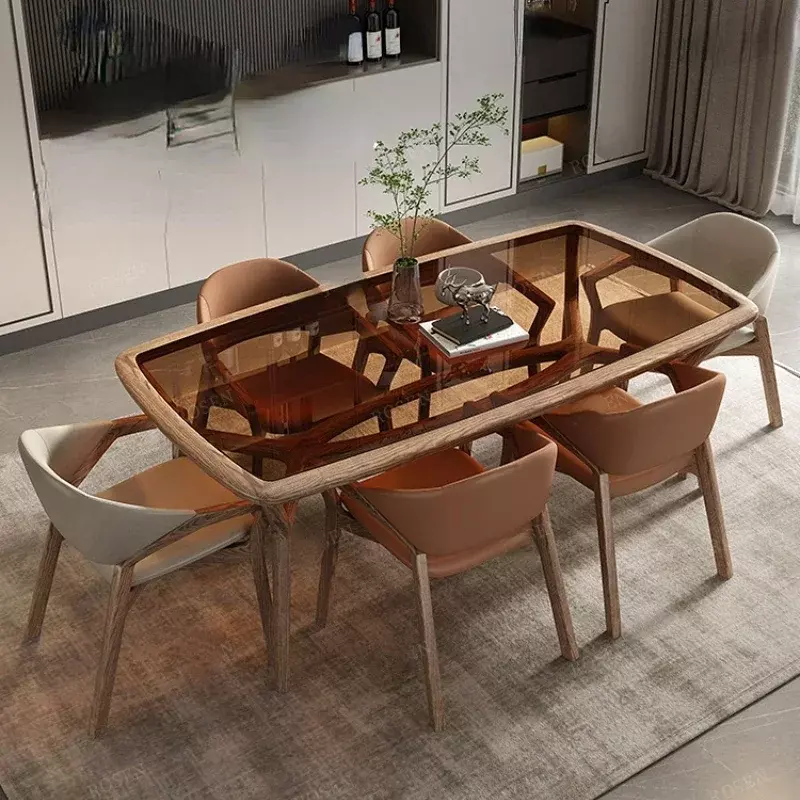 Wooden dining table with glass top and chic chairs. This dining table and luxurious chairs add a touch of elegance and sophistication to any home. Featuring a modern wooden design and elegant glass top, it's the perfect piece of furniture for dining or social gatherings.