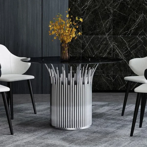 الكراسي مصممة بأسلوب مريح وفخم، محشوة بإسفنج عالي الجودة ومغطاة بـ جلد ناعم فاخر يمنح إحساسًا بالراحة والأناقة. الانحناءات المدروسة في الظهر والمقعد توفر تجربة جلوس مثالية خلال الأكل أو الجلسات الطويلة.