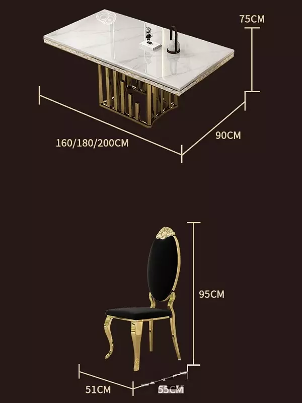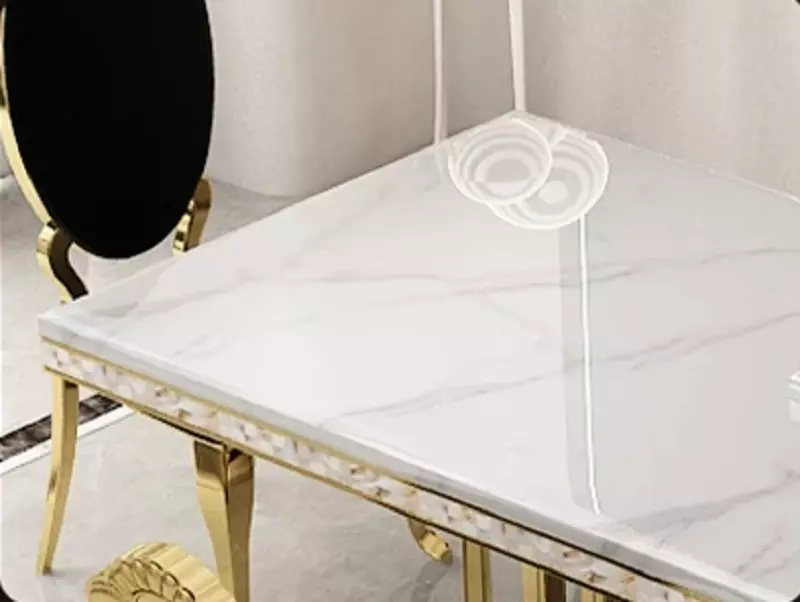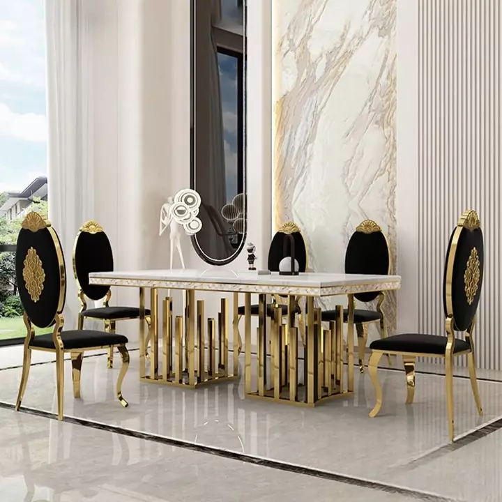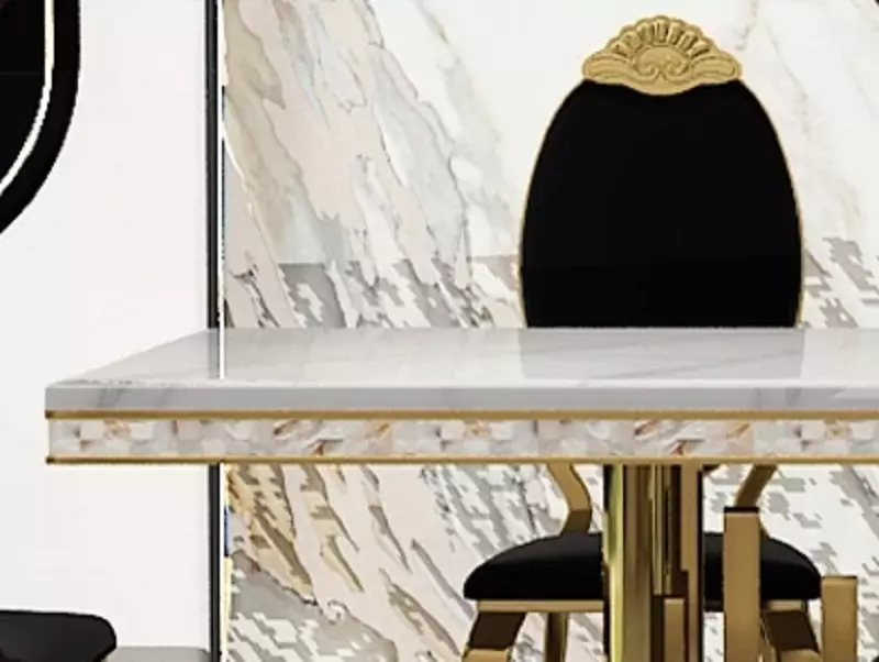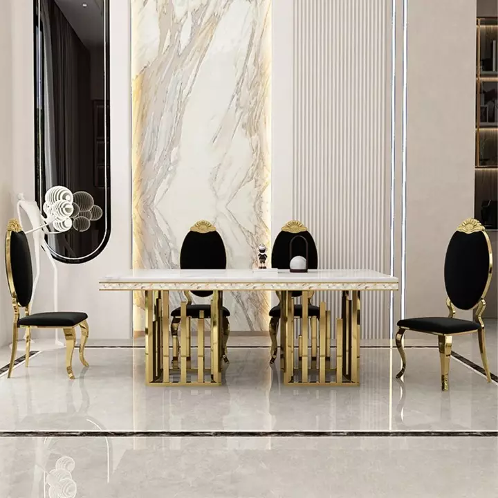 This marble dining table features a high-quality, glossy, and durable surface, adding a touch of luxury and elegance to your home. The table's frame is constructed from a solid gilded steel base, ensuring stability and strength.