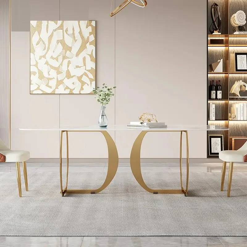 خامة الطاولة: هيكل مصنع من معدن ستيلي مذهب فخم عالي الجودة مع سطح رخامي متين ولامع.
