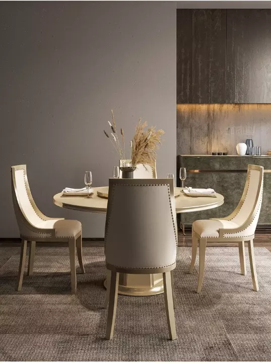 Enjoy a luxurious dining experience with a round dining table and chairs in a royal design. Made of high-quality engineered wood and Roman beech wood, with a sturdy metal base, the chairs are comfortable thanks to high-quality foam and luxurious leather upholstery. Available in multiple sizes to suit your needs, they are easy to clean and come with a two-year warranty against manufacturing defects in the GCC. The elegant color complements any decor.