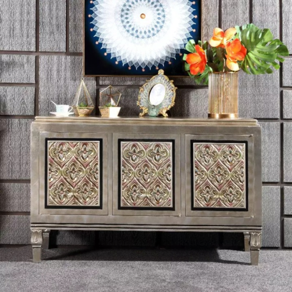 This buffet table with multiple drawers combines modern design with practical functionality. It's crafted from an engineered wood frame and high-quality beech wood for durability and beauty, with spacious drawers for optimal organization. It features easy cleaning and an elegant finish that complements a variety of decor styles. The color is shown in the pictures, and it comes with a two-year warranty against manufacturing defects in the GCC.