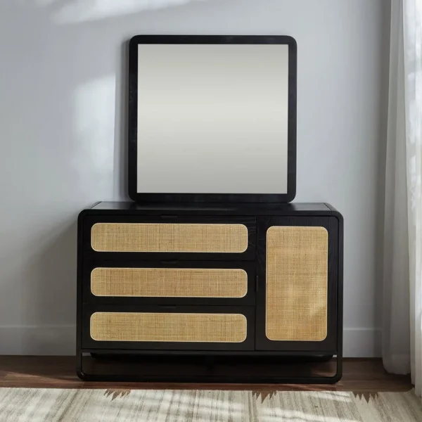 The dresser features a spacious vanity table, providing ample space for organizing your cosmetics and accessories. It also comes with a large mirror that reflects light and adds a sense of spaciousness to the room.