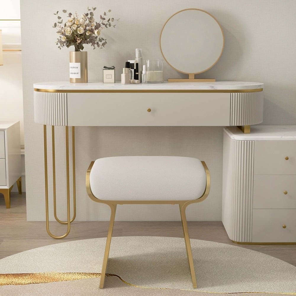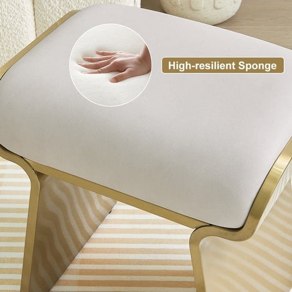 كرسي تسريحة مريح وأنيق بتصميم عصري بدون ظهر، مع تنجيد فاخر وإطار قوي من الفولاذ المقاوم للصدأ بلون ذهبي، مثالي لجلسات العناية اليومية.