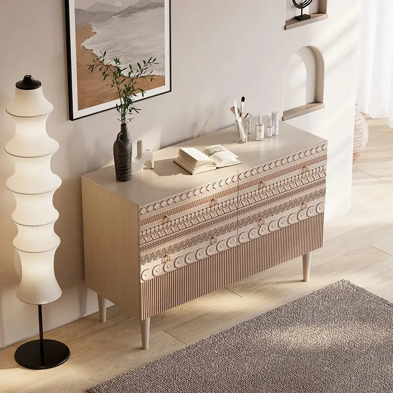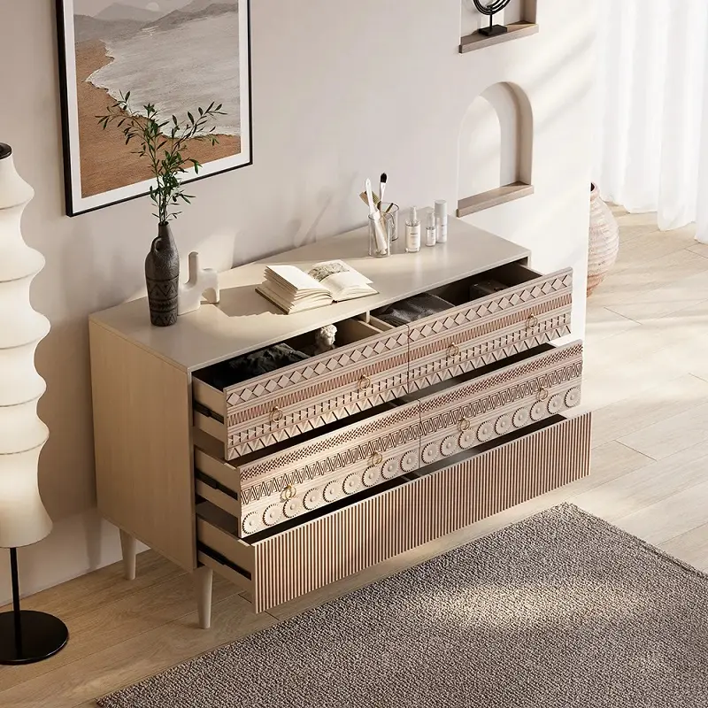 اللوحات الأمامية للأدراج بتفاصيل منحوتة تعطي طابعًا بوهو عصريًا يناسب الديكورات الهادئة والحديثة. حضورها واضح كقطعة ديكور، لكنها في الوقت نفسه لا تطغى على بقية الأثاث، ما يسهّل تنسيقها مع أكثر من أسلوب.