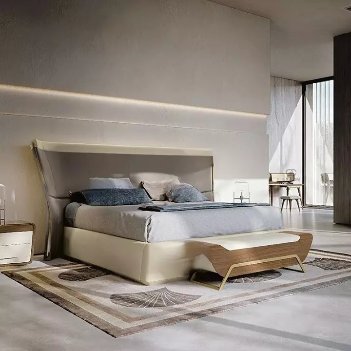 A luxurious bedroom bed designed to add a stylish and modern touch to your space. Made from high-quality engineered wood and Romanian beech wood, it's upholstered in premium leather for comfort and durability. Available in multiple sizes to suit your needs. The curved back provides extra support and comfort while sitting. It comes with a two-year warranty against manufacturing defects. This product is ideal for those seeking luxury and quality in their bedroom.