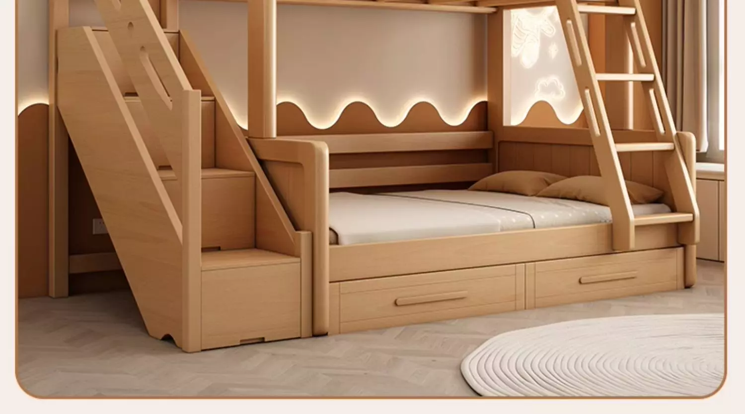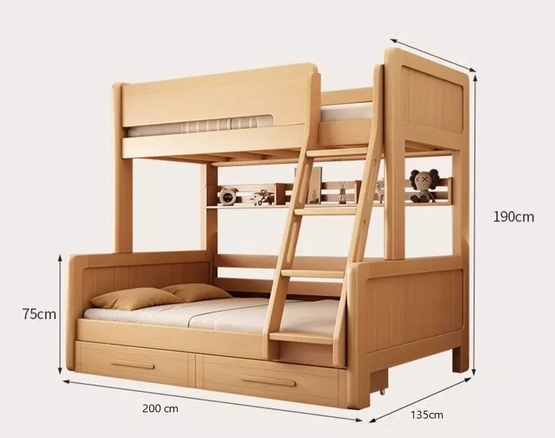 يتميز هذا السرير بكونه سريرًا مزدوجًا، مما يوفر المساحة ويتيح لك استغلال الغرفة بشكل أفضل. الهيكل مصنوع من خشب هندسي وخشب زان روماني عالي الجودة، مما يضمن لك المتانة والثبات لسنوات طويلة. هذا السرير يعد حلاً مثالياً للعائلات التي تحتاج إلى مساحة إضافية دون التنازل عن التصميم والأناقة.