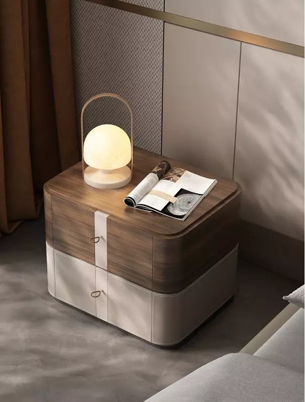 A luxurious European-designed side table from Master Room combines elegance and practicality. Made from high-quality engineered wood and Romanian beech, it's covered in premium Italian leather for a sophisticated touch. It features practical dimensions and a distinctive wood color with multiple leather color options. It's easy to clean and comes with a two-year warranty against manufacturing defects. Perfect for adding a touch of luxury to your bedroom.