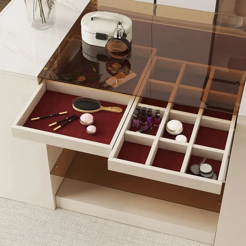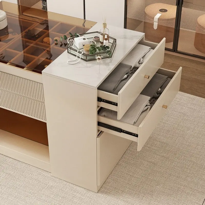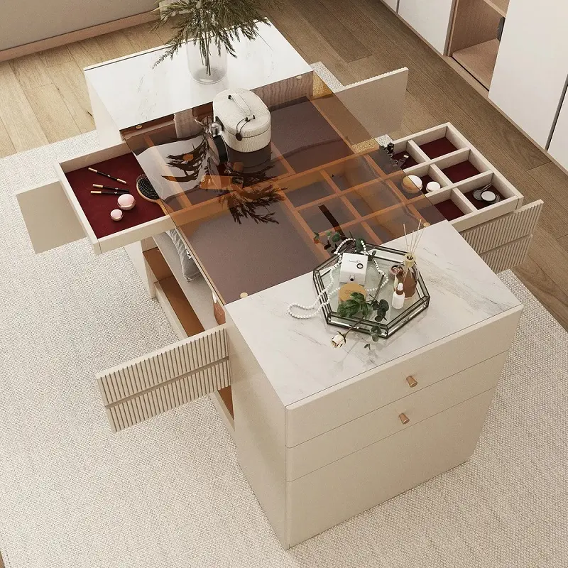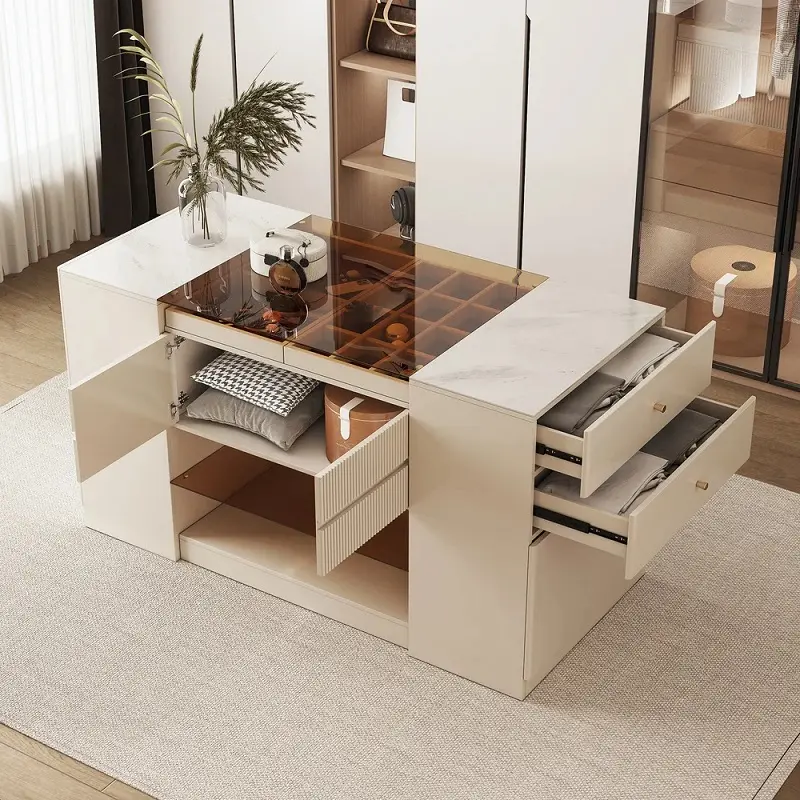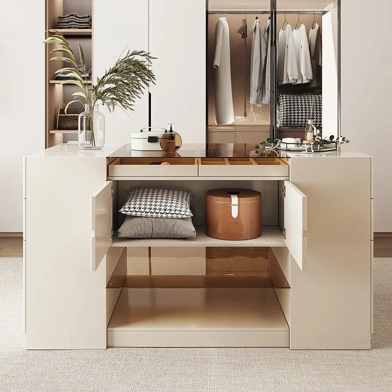 خزانة ملابس بيضاء مودرن مع أدراج وأبواب تم تصميم التسريحة بارتفاع مناسب يسهل استخدامه يوميًا دون عناء، مع عرض واسع يكفي لتخزين وتنظيم مستحضرات العناية الشخصية أو الإكسسوارات بطريقة منظمة. عمقها يسمح بوضع العناصر دون أن تستهلك حيزًا زائدًا من الغرفة، ما يجعلها مثالية للمساحات المتوسطة والصغيرة على حد سواء.