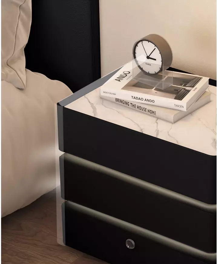 - تتميز طاولة جانبية للسرير بتصميم عصري باللون الأسود مع إضاءة مدمجة تضيف لمسة جمالية تبهر العين.