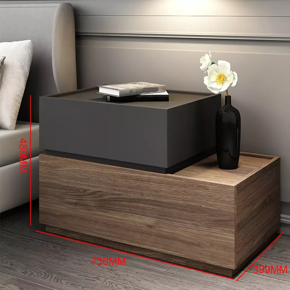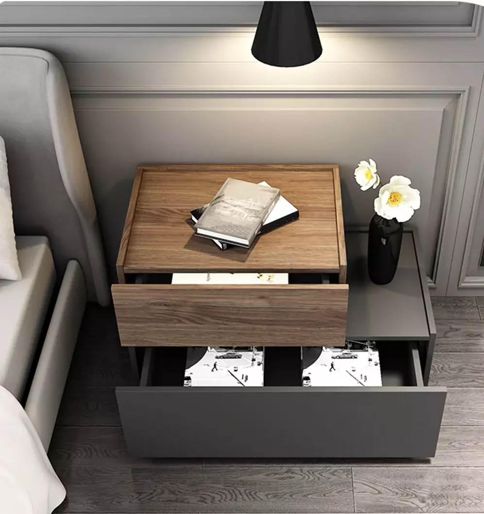 - تتميز طاولة خشب للسرير بتصميم أنيق وعصري بمزيج مثالي بين اللون الرمادي والسطح الخشبي الطبيعي.