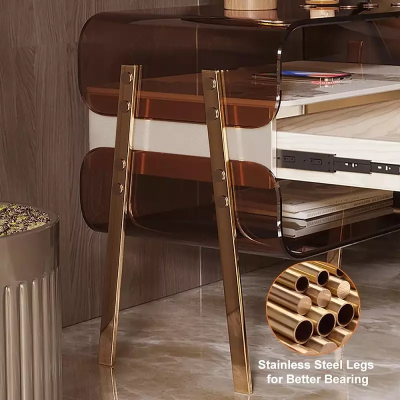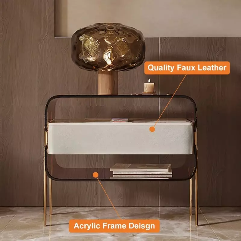 A stylish and contemporary bedroom side table with a modern Italian design, combining beauty and functionality. Made of high-quality engineered wood and Roman beech wood, with an acrylic frame and sturdy metal legs, it features a drawer for convenient storage and can be easily wiped clean. Perfect for adding a luxurious touch to your bedroom decor. Colors shown in the image, with a two-year warranty against manufacturing defects in the Gulf countries.