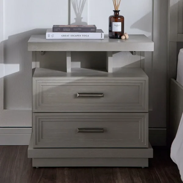 This two-drawer bedside table with a shelf is more than just a holder for a light or a glass of water. With two drawers and a spacious shelf, it provides ample storage space for books, magazines, electronics, and other essentials. Use the shelf to display your favorite decorations or indoor plants, while the drawers allow you to store your personal items.