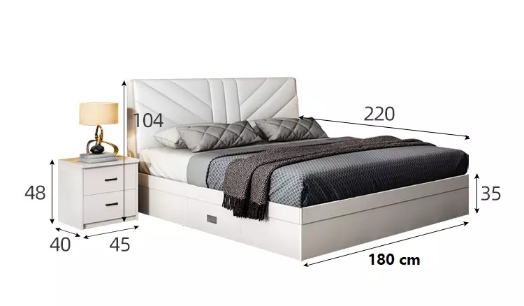 - مقاس السرير:ارتفاع: 104 سم، عمق: 220 سم، عرض: 180سم.