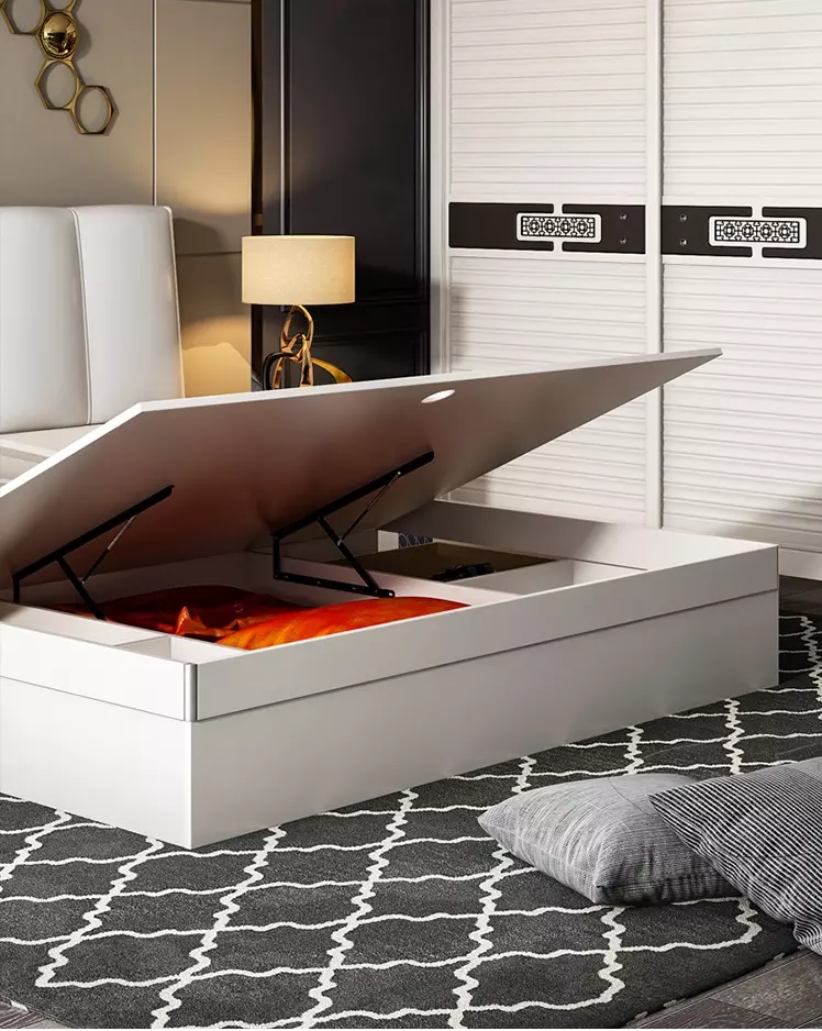 - ظهر السرير مبطن بإسفنج عالي الكثافة ومغطى بجلد فاخر يضفي عليه لمسة راقية ويمنحك تجربة استرخاء فاخرة.