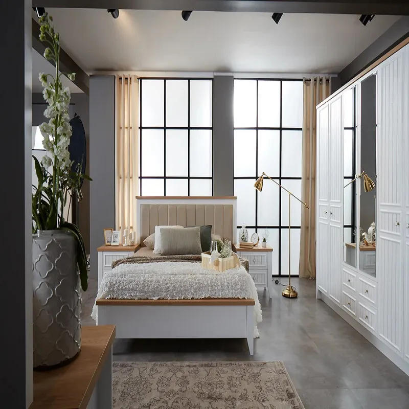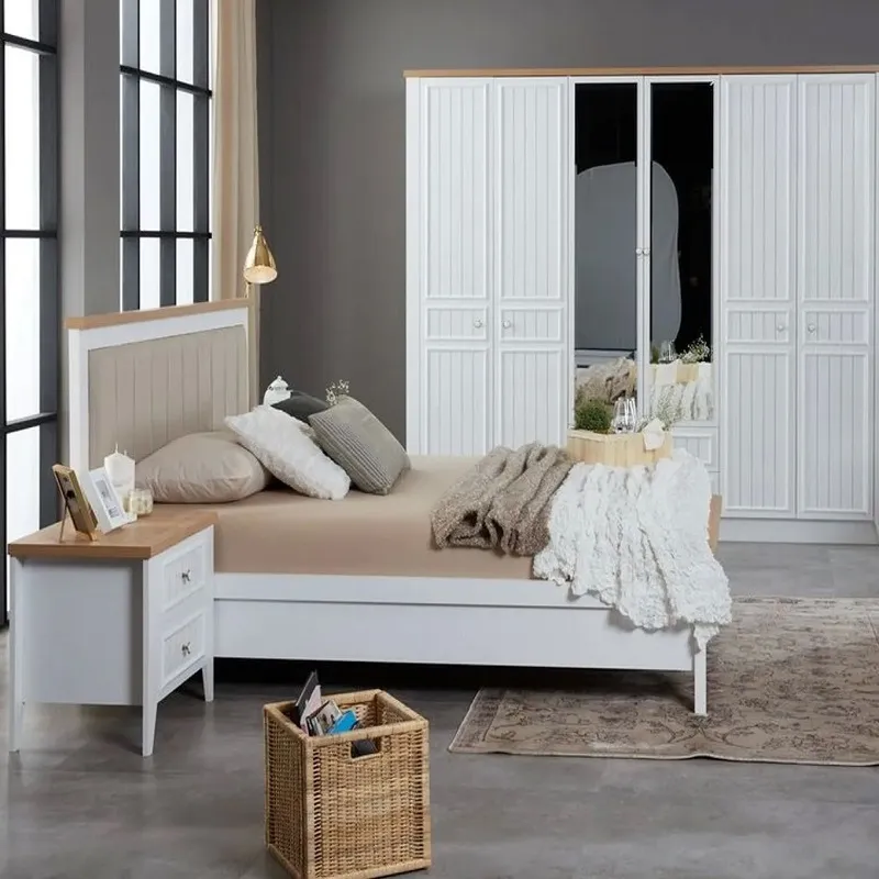 غرفة نوم كاملة كلاسيكية من ماستر روم. تضم سرير مبطن بالإسفنج عالي الكثافة مع قماش ناعم، خزانة ملابس واسعة، كومودينة أنيقة، وتسريحة عملية تضيف لمسة من الرقي لبيتك. مصنوعة من خشب هندسي وزان روماني عالي الجودة، مع ضمان سنتين ضد عيوب التصنيع.