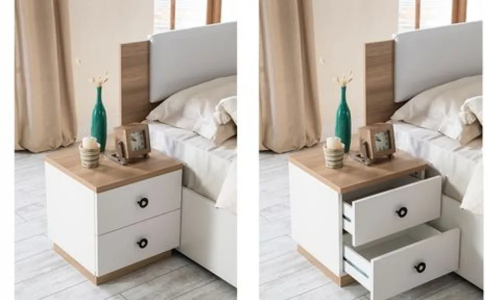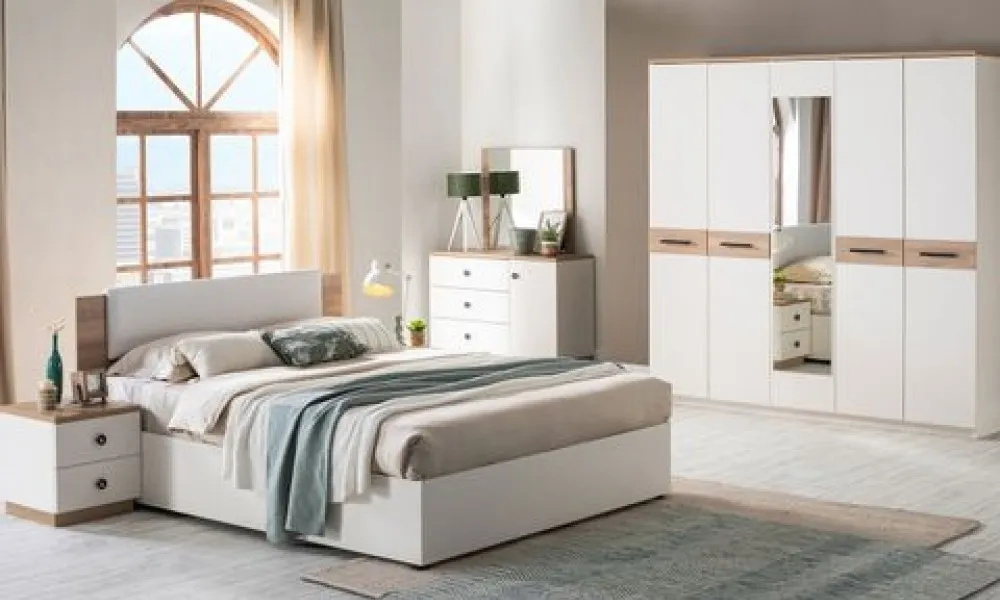 الغرفة تحتوي على سرير مريح مصنوع من هيكل خشب هندسي وخشب زان روماني عالي الجودة، مغطى بطبقة من القماش الناعم المبطن بالإسفنج عالي الكثافة والمرونة، ليمنحك تجربة نوم مثالية. كما تأتي الغرفة مزودة بـ خزانة ملابس واسعة بأبواب عملية توفر لك المساحة المثالية لترتيب الملابس. بالإضافة إلى تسريحة أنيقة بلمسة من الزجاج المقوى تعكس مظهراً عصرياً وتضيف لمسة جمالية للديكور، إلى جانب كومودينة خشبية صلبة عملية لحاجياتك اليومية.