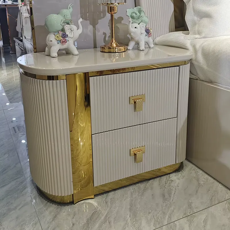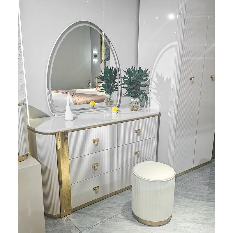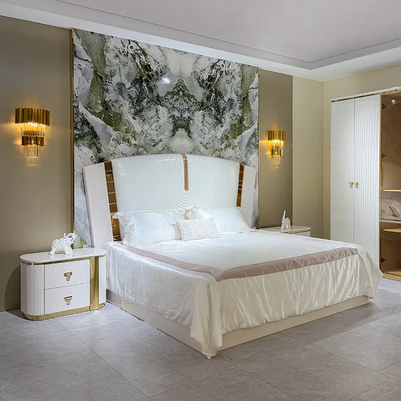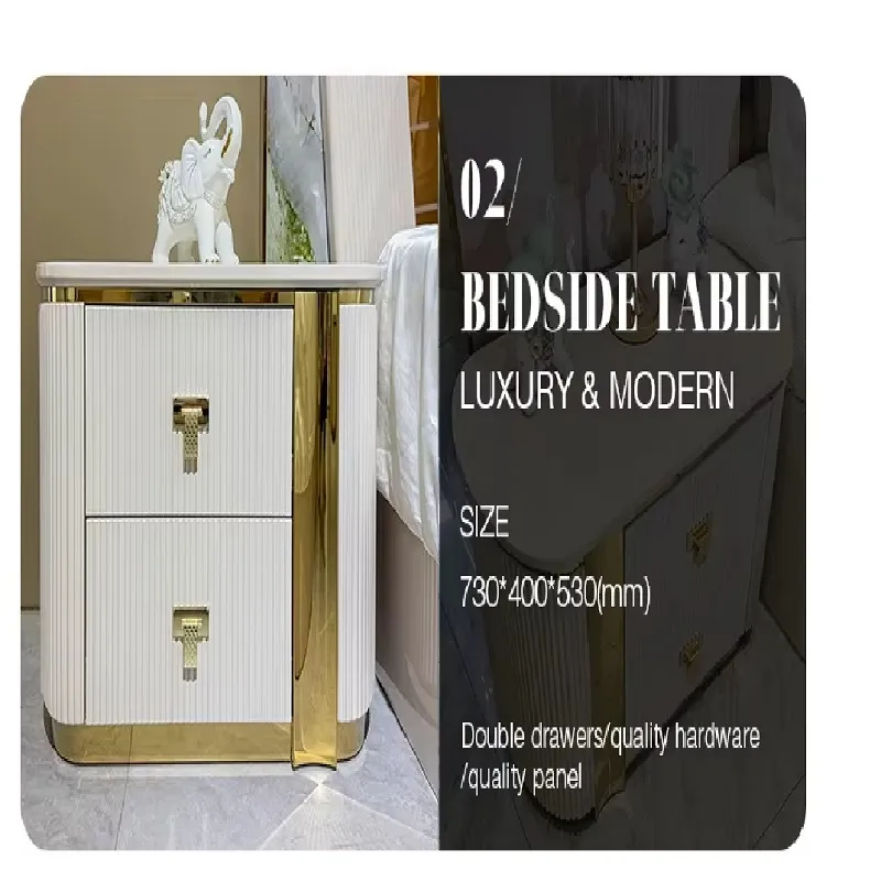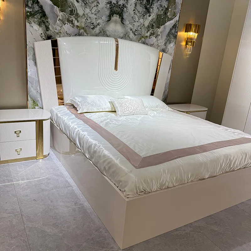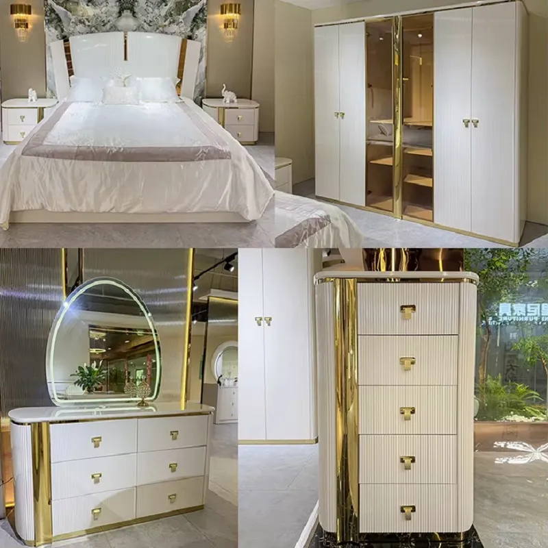 تم تصنيع الغرفة من خشب هندسي وخشب زان روماني متين لضمان قوة التحمل وطول العمر. كما أضيفت لمسات من الستانلس ستيل المذهب الصلب لإبراز الفخامة، بينما جاء ظهر السرير مغطى بـ الجلد الإيطالي الناعم والمريح المبطن بالإسفنج عالي الكثافة ليمنحك راحة لا مثيل لها.