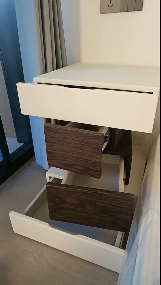 - يتميز بمقابض معدنية صغيرة تعزز من أناقة التصميم وتسمح بفتح الأدراج بسهولة وسلاسة.