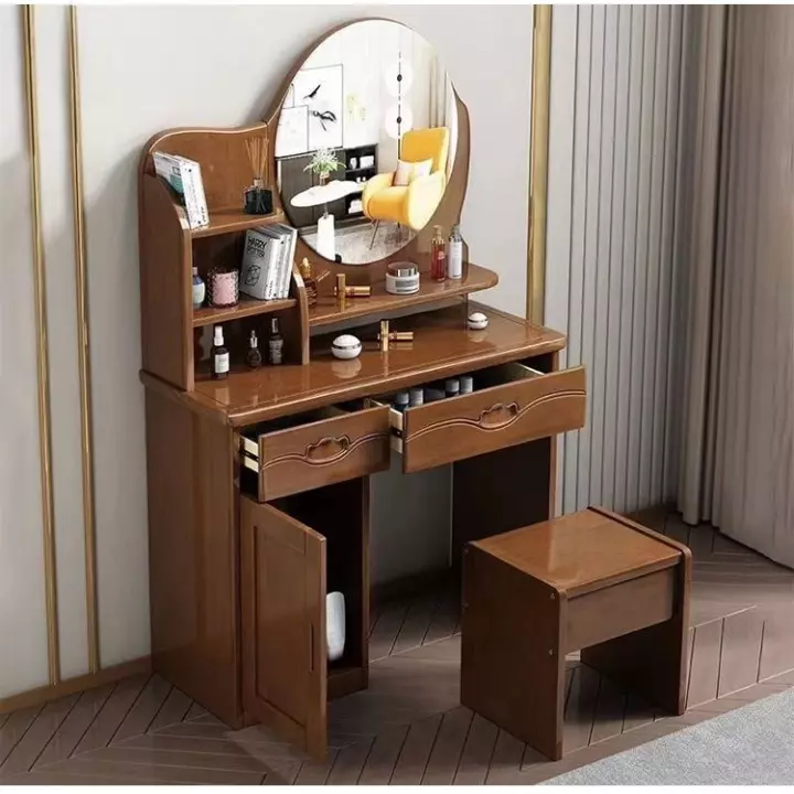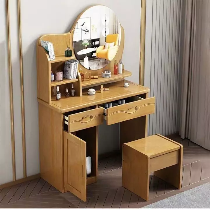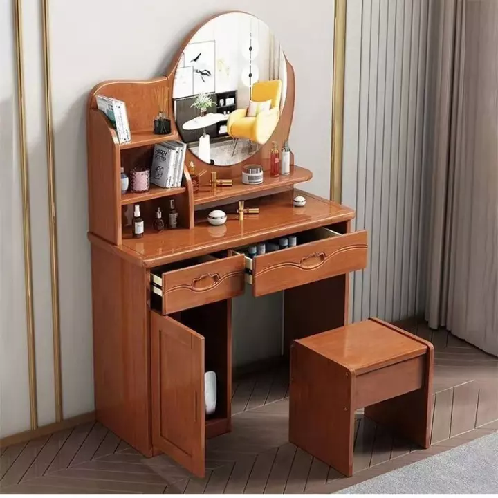 - Distinctive hairstyleAttractive design with a circular mirror, drawers and shelves for easy cosmetic storage.