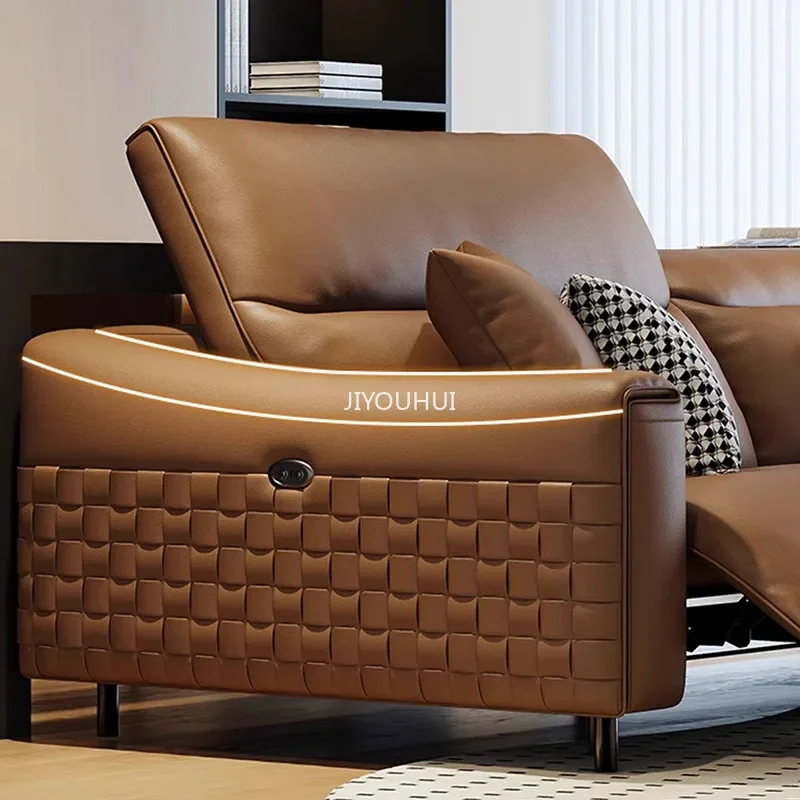 A comfortable living room sofa with a footrest in a luxurious design, designed to give you a sophisticated European touch and an attractive, elegant appearance that reflects good taste. The sofa comes in a luxurious brown color and is made of high-quality leather materials, adding a warm touch and a luxurious appearance to the living room. Its tiered design gives you a sense of depth and comfort at the same time.