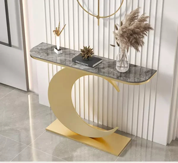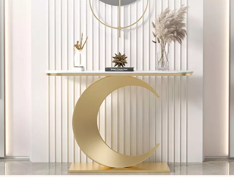 هذه الطاولة تتميز بقاعدة على شكل هلال مما يضيف على الكونسول مظهرًا فريدًا وجذابًا. القاعدة المعدنية المتينة متوفرة باللونين الذهبي والأسود، مما يجعلها تتناسب مع مختلف أنماط الديكور.