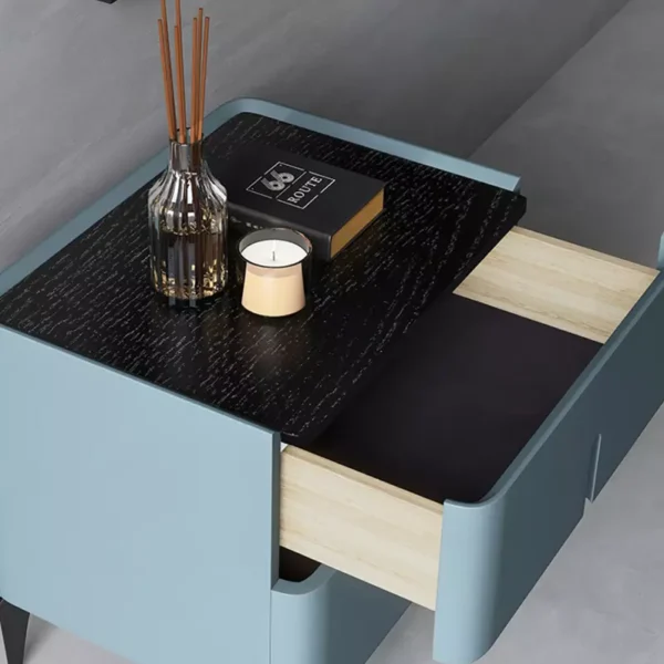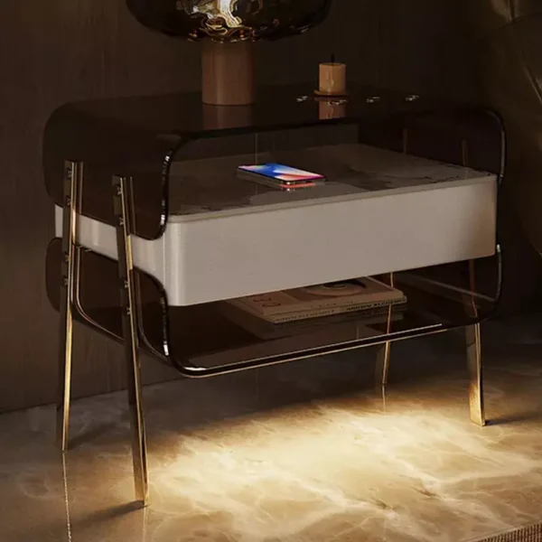 A stylish and contemporary bedroom side table with a modern Italian design, combining beauty and functionality. Made of high-quality engineered wood and Roman beech wood, with an acrylic frame and sturdy metal legs, it features a drawer for convenient storage and can be easily wiped clean. Perfect for adding a luxurious touch to your bedroom decor. Colors shown in the image, with a two-year warranty against manufacturing defects in the Gulf countries.